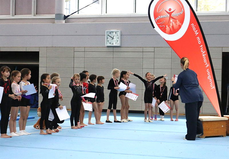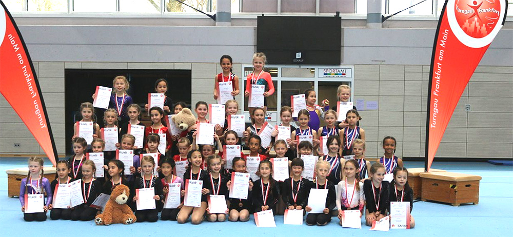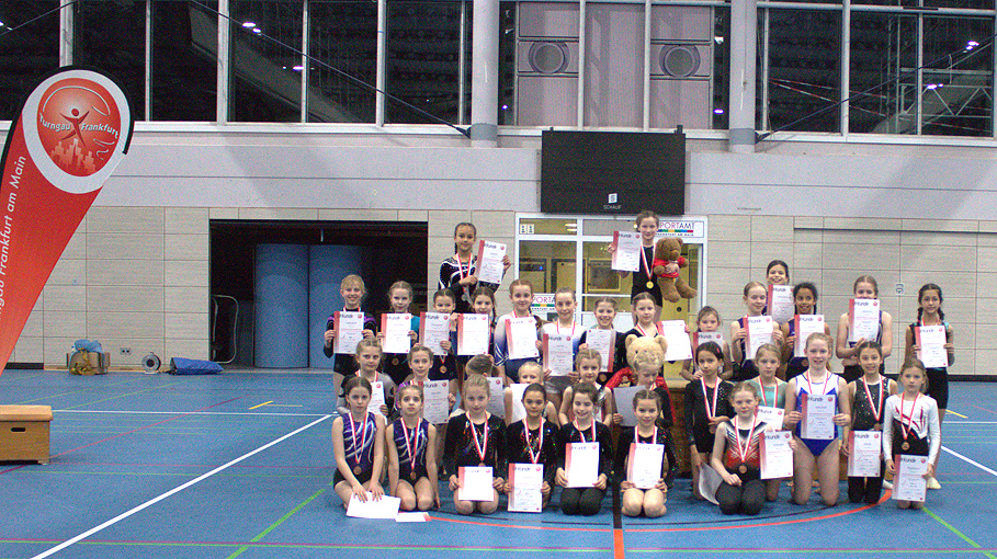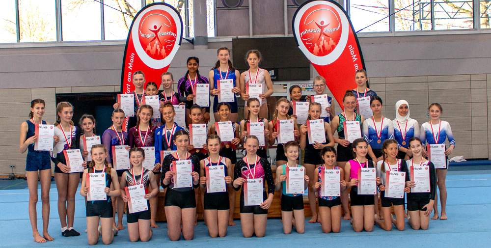 Alle Turnerinnen zeigten ihr Können und hatten sichtlich Spaß dabei den anwesenden Zuschauenden ihre Kürübungen zu zeigen. Geturnt wurden zwei Wettkämpfe, im Rahmenwettkampf LK 4, hier gibt es keine Altersbegrenzung. Im Qualifikationswettkampf LK 4 Jahrgang 2014 – 2016 turnten 12 Turnerinnen darum den Turngau Frankfurt bei den Hessischen Einzel-Landesfinals im Mai zu vertreten. Bei der Siegerehrung freuten sich alle über ihre Urkunden und die Jubiläumsmedaillen des Turngau Frankfurt am Main.